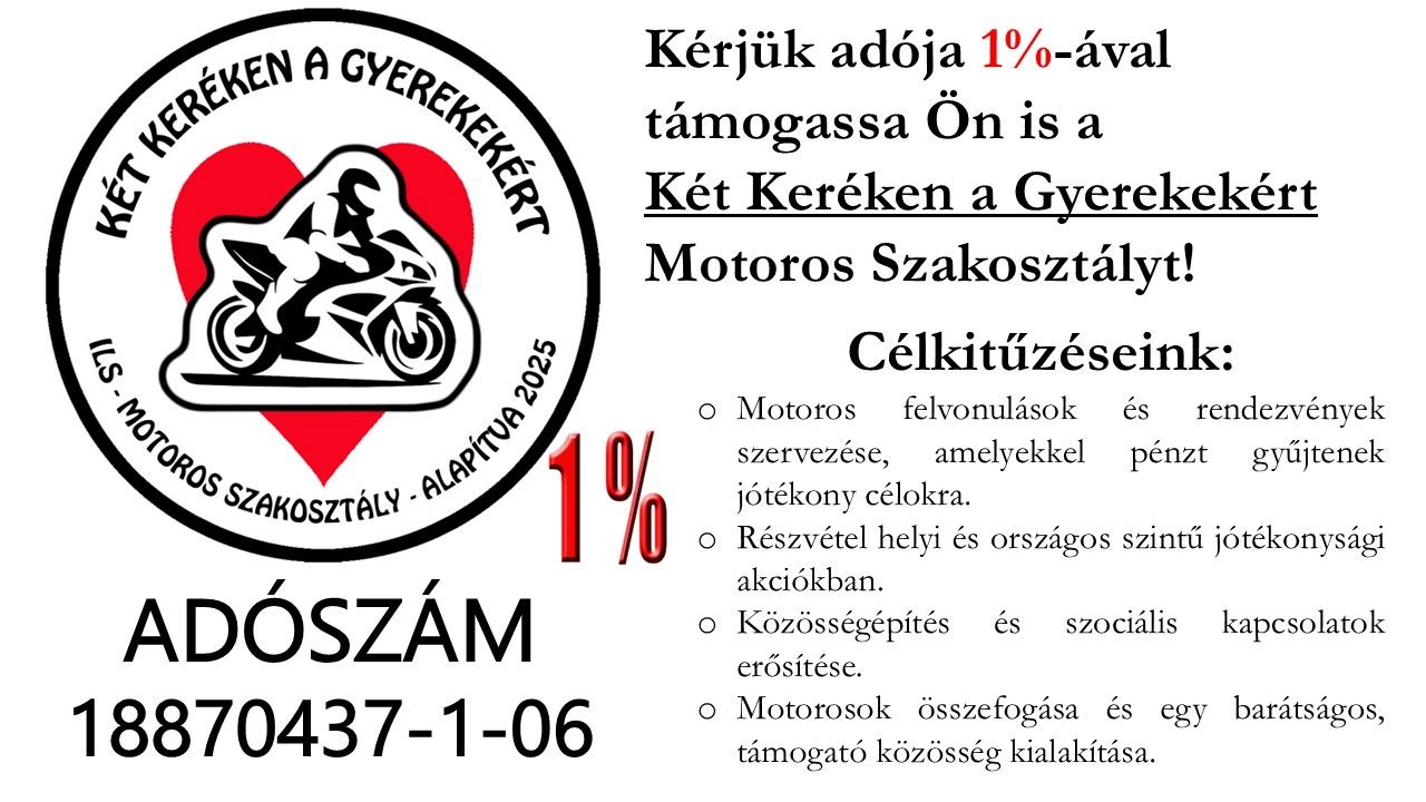 A Két keréken a gyerekekért motoros szakosztály munkáját segítem, ahol célunk, hogy a motorozás élményét és az összefogás erejét minél több gyermekhez és rászoruló családhoz eljuttassuk. Hiszek abban, hogy a motoros közösség valódi értéket tud teremteni, és büszke vagyok, hogy ezért a jövő generációjáért dolgozhatok.